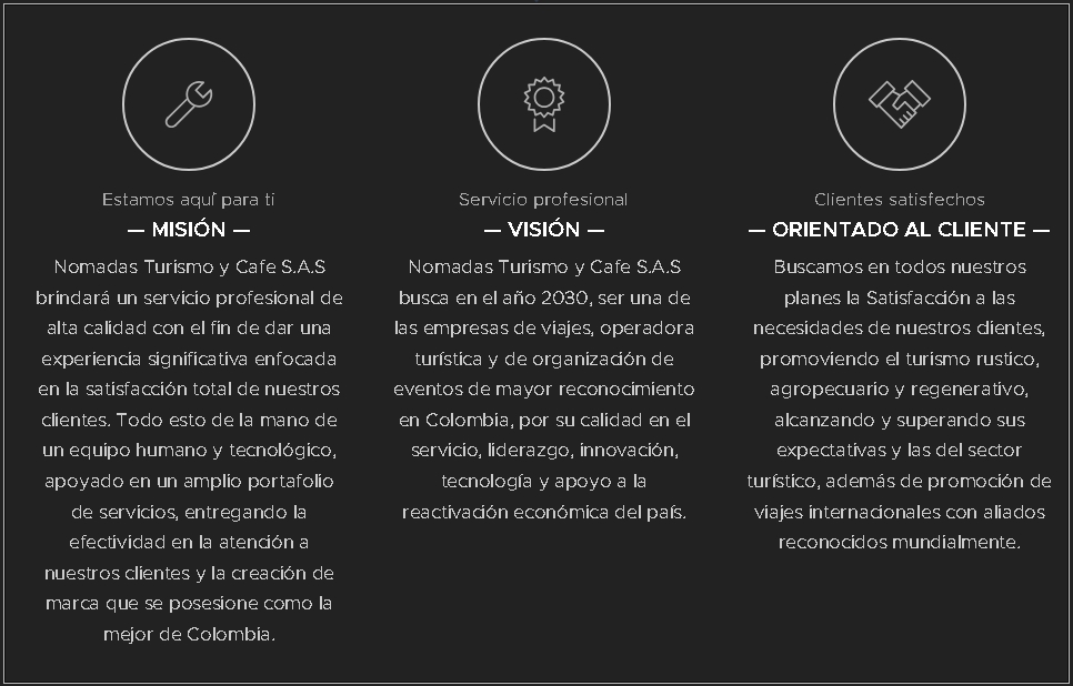 — UNA ESCAPADA A LUGARES TRANQUILOS Y CON TRADICION CAFETERA — Nómadas Turismo y Café S.A.S es una agencia de viajes, operadora turística y de eventos, conformada por un grupo de profesionales que a través del turismo identificamos la oportunidad de hacernos participes de la reactivación económica del país fortaleciendo las áreas rurales, y los más hermosos paisajes de las regiones colombianas, además de ofrecer un portafolio de gestión integral de eventos, y viajes internacionales con el fin de satisfacer los gustos de todos nuestros Clientes.